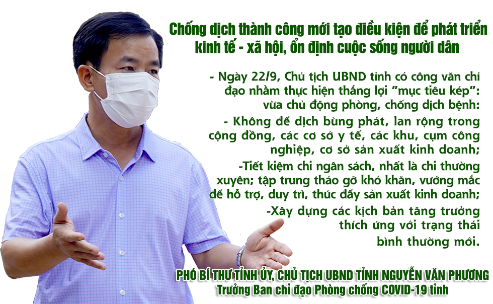 Về kết quả bước đầu phòng, chống dịch trên địa bàn tỉnh sau nhiều tháng căng thẳng, Phó Bí thư Tỉnh ủy, Chủ tịch UBND tỉnh Nguyễn Văn Phương cho rằng, tỉnh đã tập trung mọi nỗ lực thực hiện “mục tiêu kép”, vừa phòng chống dịch, vừa phục hồi phát triển kinh tế - xã hội. Đã kịp thời phát hiện, xử lý hiệu quả, không để dịch bệnh bùng phát và lây lan trong cộng đồng, khu công nghiệp, các khu dân cư tập trung...