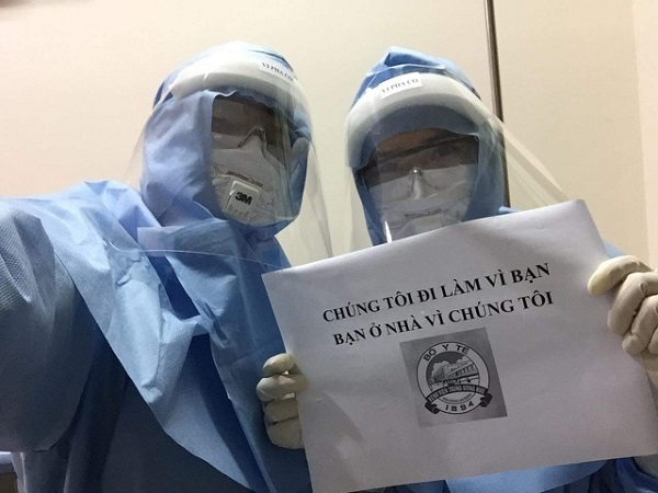Thông điệp "Chúng tôi đi làm vì bạn, bạn ở nhà vì chúng tôi" của bác sĩ Bệnh viện Trung ương Huế. ảnh: BVCC