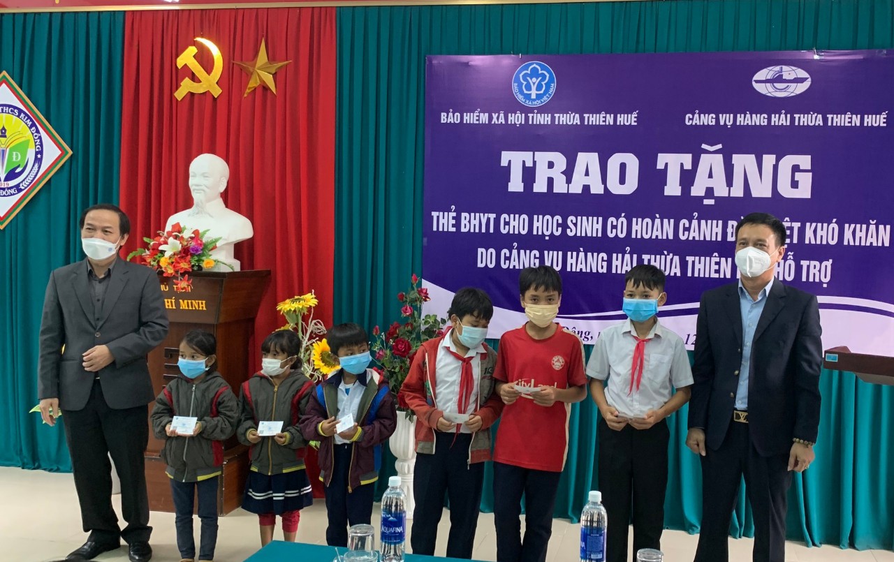 HNN.VN - Chiều 25/12, tại Trường Tiểu học và Trung học cơ sở Kim Đồng, xã Thượng Nhật (Nam Đông), Bảo hiểm xã hội tỉnh phối hợp với Cảng vụ Hàng hải Thừa Thiên Huế tặng thẻ bảo hiểm y tế (BHYT) cho học sinh có hoàn cảnh đặc biệt khó khăn của 9 trường học trên địa bàn.