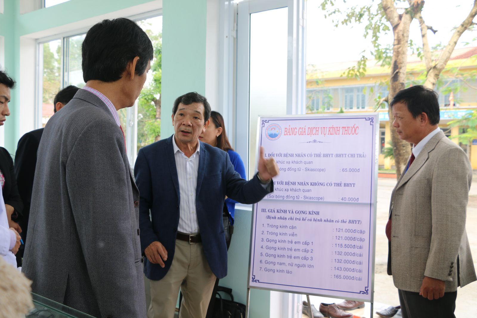 Lãnh đạo BV Mắt Huế (giữa) trao đổi thông tin đầu tư đơn vị khúc xạ huyện Phú Vang
