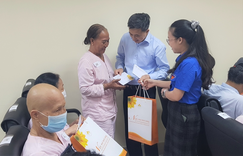| GS.TS Trần Văn Thuấn, Thứ trưởng Bộ Y tế cùng đoàn công tác trao quà cho 100 bệnh nhân ung thư bên lề hội nghị |