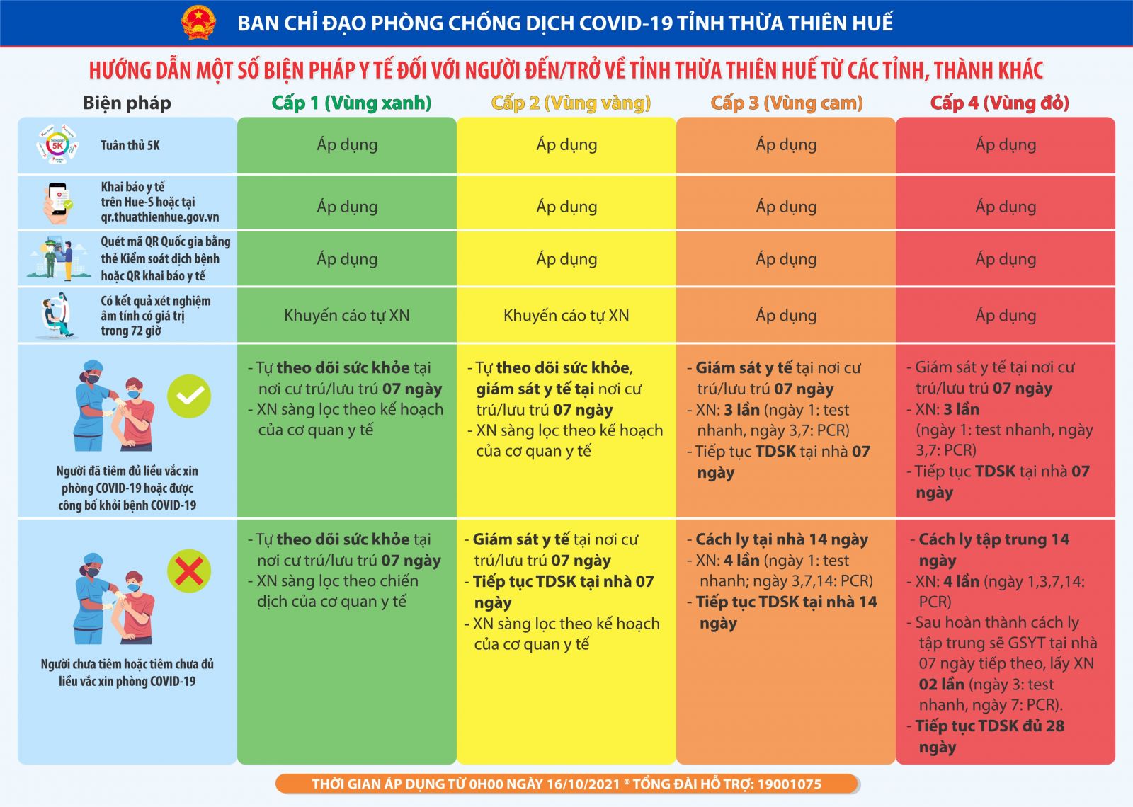 Theo đó, kể từ 00h00 ngày 16/10/2021 chỉ còn 2 nhóm đối tượng khi vào đến/về Thừa Thiên Huế phải thực hiện biện pháp cách ly để đảm bảo an toàn phòng dịch. Thứ nhất, cách ly tại nhà 14 ngày kèm xét nghiệm 4 lần (1 test nhanh, 3 PCR) đối với người đến/về từ vùng cam chưa tiêm hoặc tiêm chưa đủ liều vắc-xin phòng COVID-19. Thứ hai, cách ly tập trung 14 ngày kèm 4 lần xét nghiệm PCR đối với người đến từ vùng đỏ chưa tiêm hoặc tiêm chưa đủ liều vắc-xin phòng COVID-19.