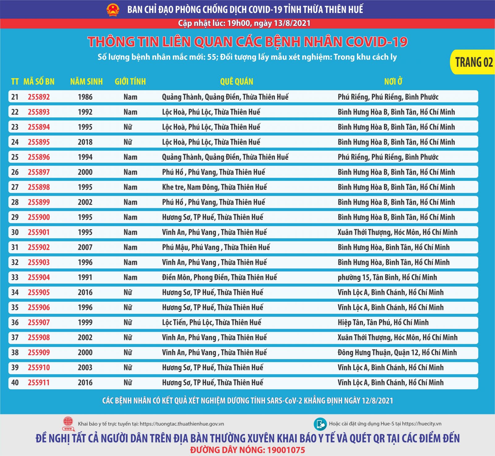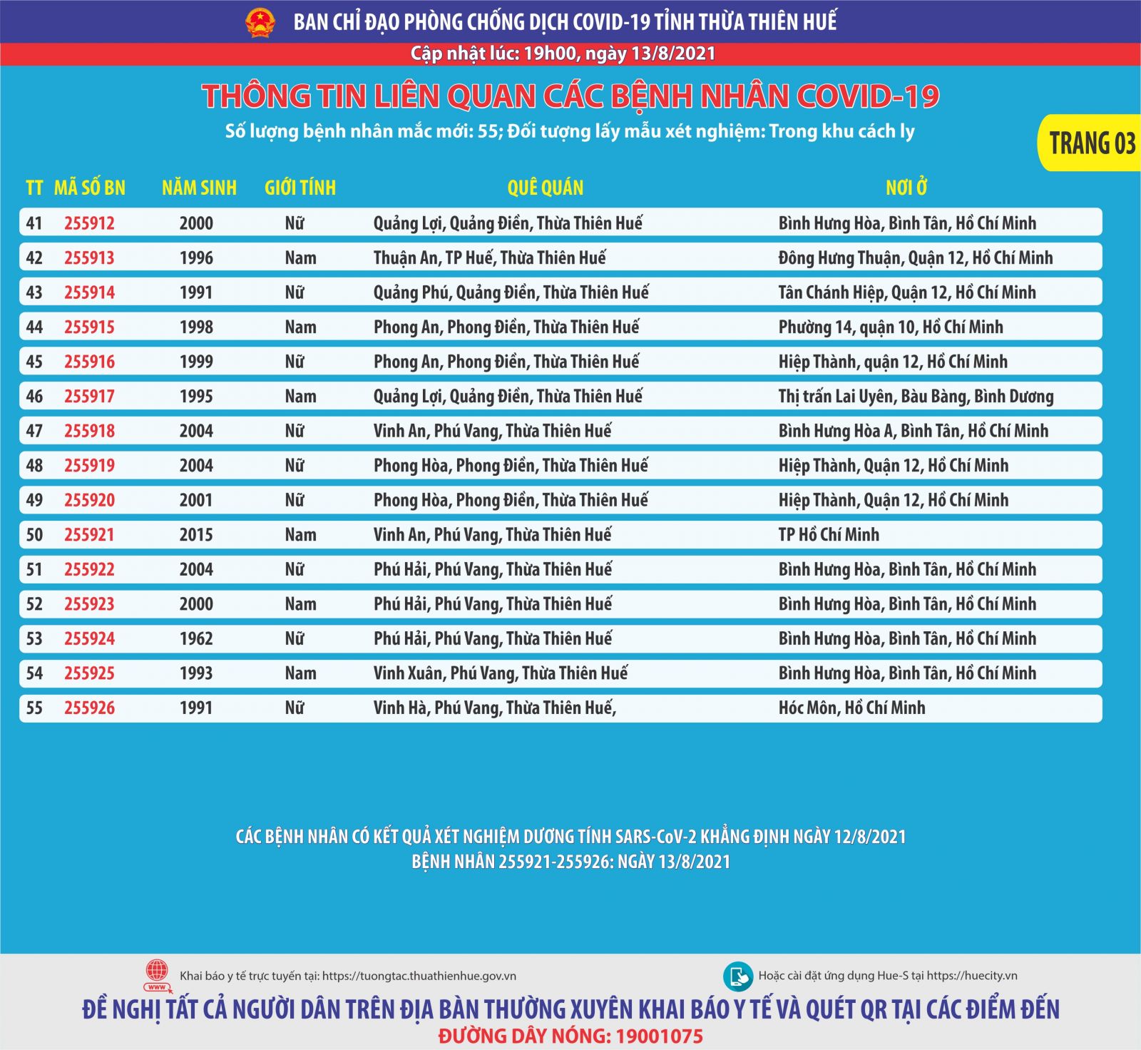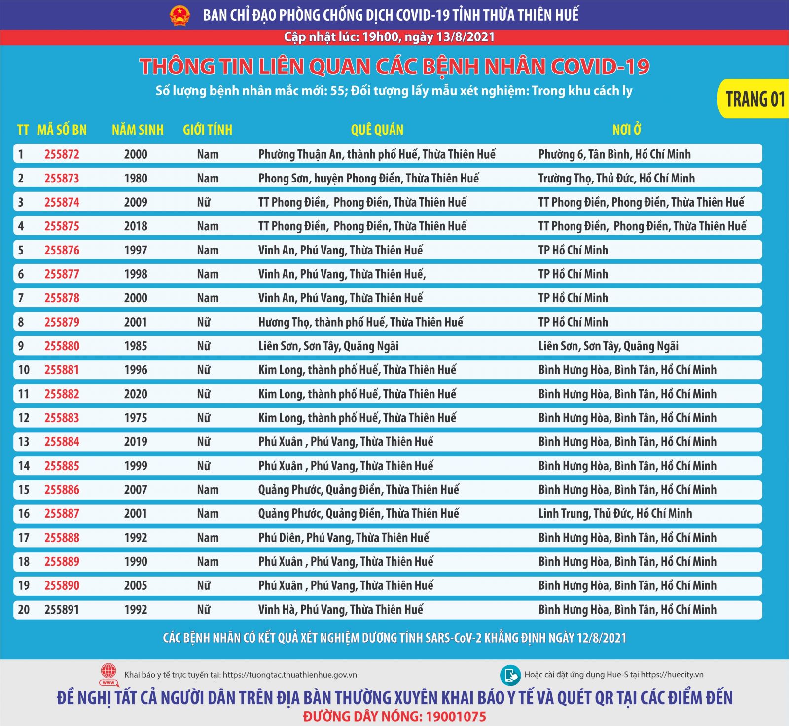 Tất cả 55 ca bệnh COVID-19 mới ghi nhận trong ngày 13/8 đều ở trong các khu cách ly tập trung và có yếu tố dịch tễ liên quan đến TP. Hồ Chí Minh và các tỉnh phía Nam. Đáng chú ý là 2 trường hợp F1 là con của 2 bệnh nhân xuất hiện ngoài cộng đồng ở thị trấn Phong Điền, huyện Phong Điền.