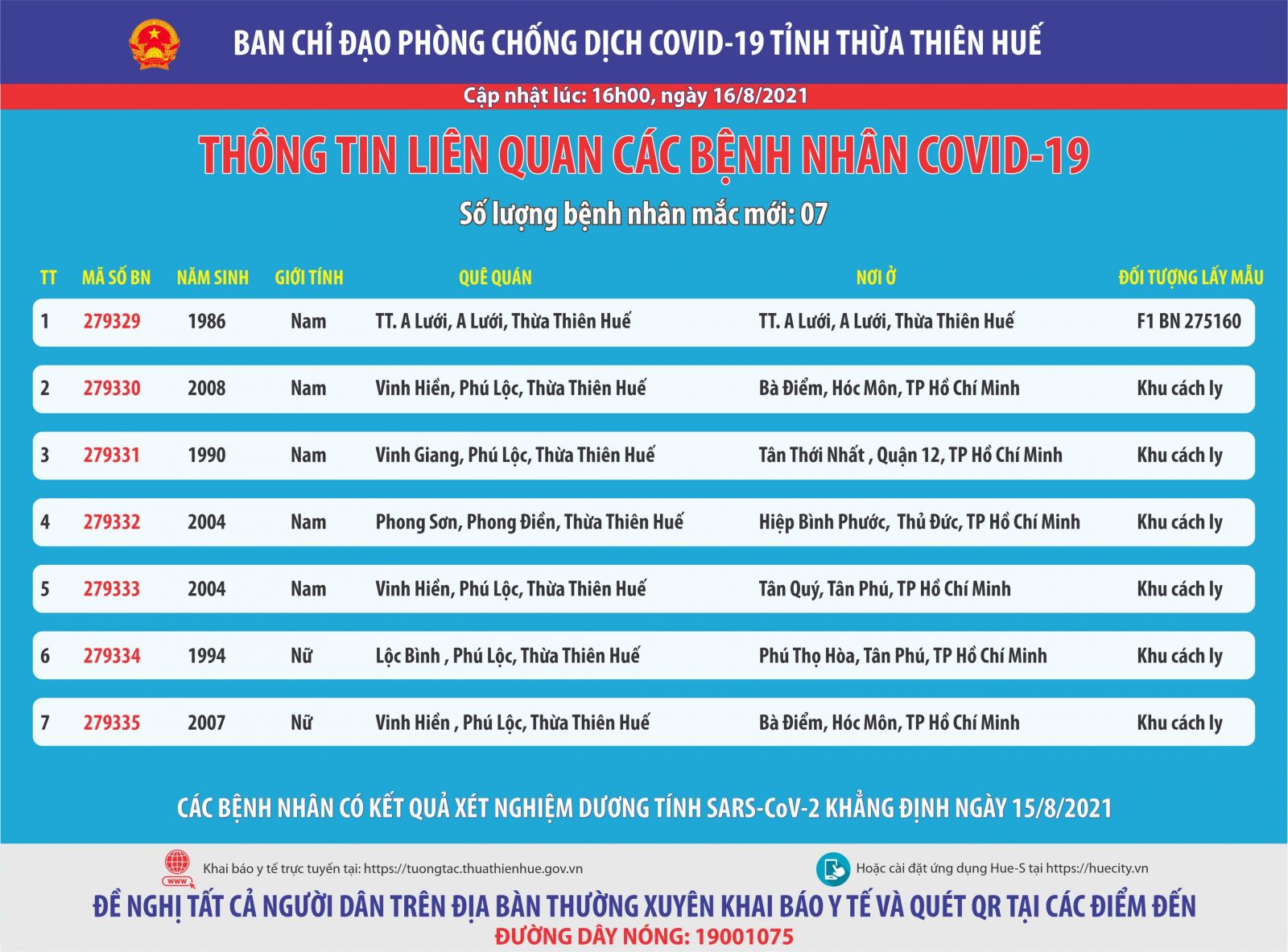 Trong số 7 ca nhiễm vừa công bố, có 1 trường hợp phát hiện ngoài cộng đồng là ca bệnh 279329, (SN 1986, trú thị trấn A Lưới), là F1 của bệnh nhân 275160 công bố trước đó 1 ngày. Các bệnh nhân còn lại đều về từ vùng dịch ở các tỉnh phía nam và đã được cách ly y tế.