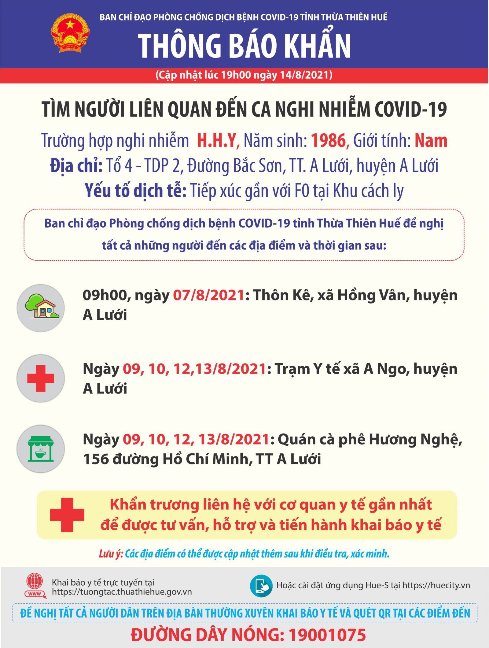 Ban Chỉ đạo phòng chống dịch COVID-19 tỉnh đề nghị những ai có đến địa điểm, có tiếp xúc gần với ca nghi nhiễm này ( thôn Kê, xã Hồng Vân, A Lưới; Trạm y tế xã A Ngo, A Lưới; quán cà phê Hương Nghệ,156 đường Hồ Chí Minh, A Lưới) khẩn trương liên hệ ngay với các cơ quan y tế gần nhất để được tư vấn, hỗ trợ và tiến hành khai báo y tế.