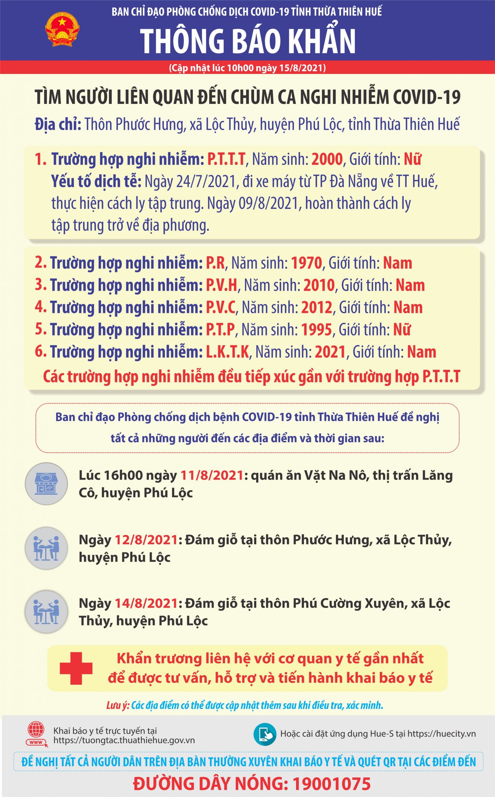 HNN.VN - Trưa 15/8, Ban Chỉ đạo phòng chống dịch COVID-19 tỉnh phát đi thông báo tìm những người liên quan đến các ca nghi nhiễm ở huyện Phú Lộc.