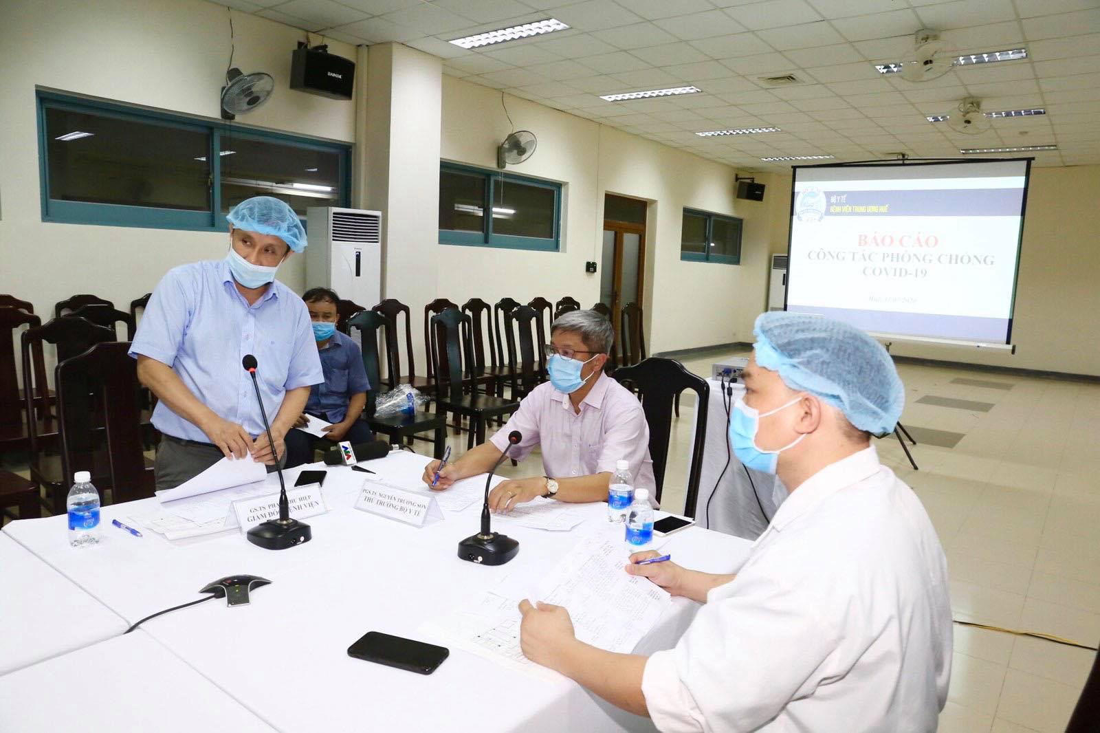 GS.TS Phạm Như Hiệp, Giám đốc Bệnh viện Trung ương Huế báo cáo tình hình với Thứ trưởng Nguyễn Trường Sơn. Ảnh: BV cung cấp