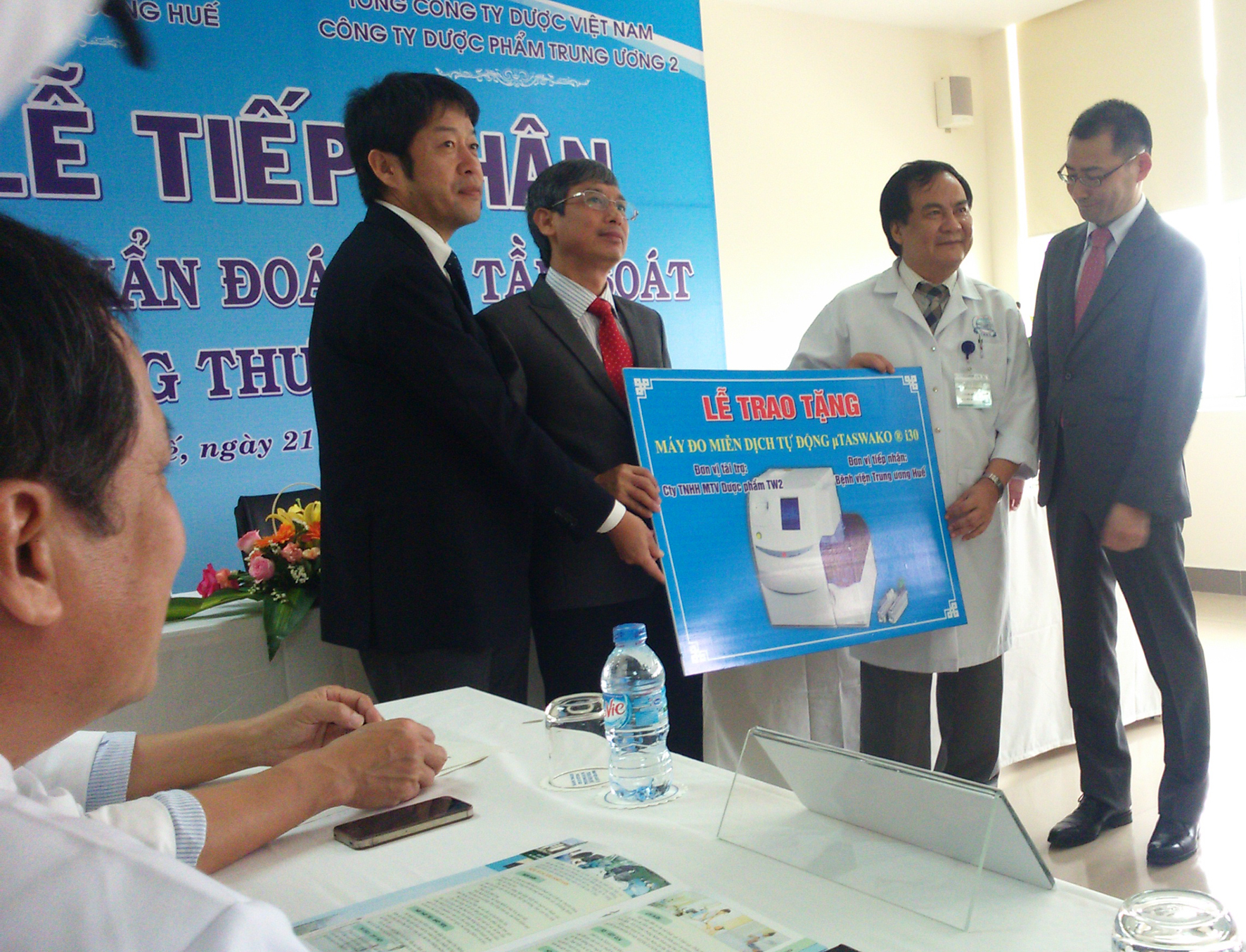 Giám đốc Bệnh viện TƯ Huế Bùì Đức Phú tiếp nhận tượng trưng máy chẩn đoán và tầm kiểm sóat ung thư gan Wako