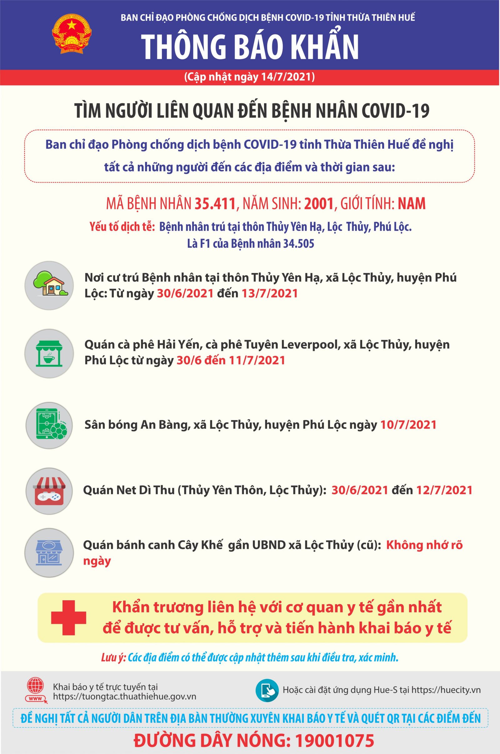 Liên quan đến ca bệnh 35.411, Ban Chỉ đạo phòng, chống dịch bệnh COVID-19 tỉnh Thừa Thiên Huế thông báo và đề nghị tất cả những người đến các địa điểm và thời gian sau khẩn cấp liên hệ với cơ sở y tế gần nhất để được tư vẫn, hỗ trợ và khai báo y tế, gồm: