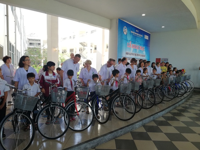 Cũng vào sáng 2/5, Tổ chức ADM phối hợp với BV Trung ương Huế Cơ sở 2 tổ chức lễ trao tặng 20 chiếc xe đạp cho các em học sinh nghèo huyện Phong Điền để các em thuận tiện trong việc đến trường.