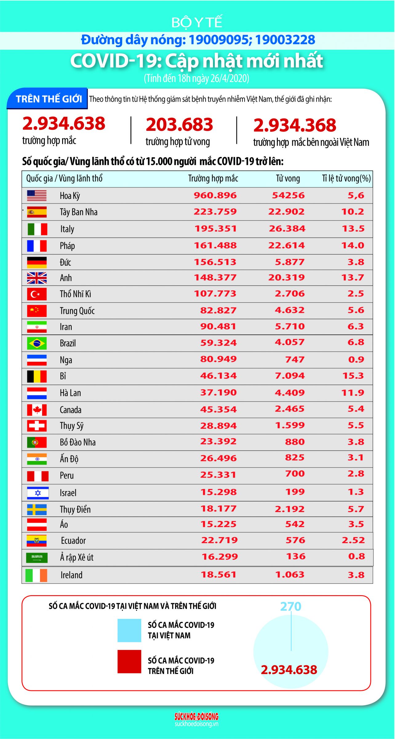 Trên thế giới, dịch bệnh đã lan ra 212 quốc gia và vùng lãnh thổ với 2.934.638 người mắc; 203.683 người tử vong, trong đó: Hoa Kỳ: 960.896 người mắc; 54.256 người tử vong; Tây Ban Nha: 223.759 người mắc; 22.902 người tử vong; Italy: 195.351 người mắc; 26.384 người tử vong; Pháp: 161.488 người mắc; 22.614 người tử vong.