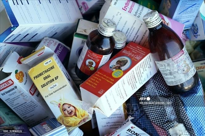 | Thu hồi siro ho nghi là nguyên nhân khiến trẻ em tử vong tại Banjul, Gambia ngày 6/10/2022. Ảnh: AFP/TTXVN |