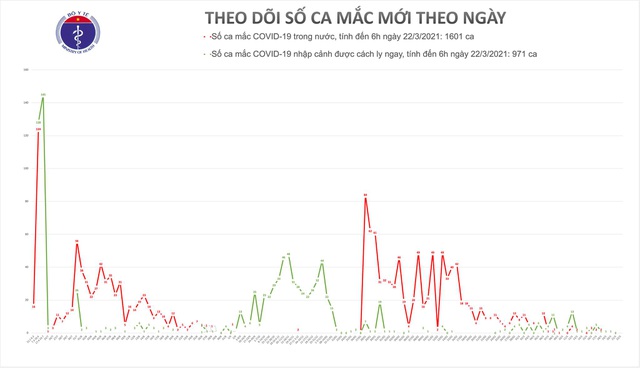 Tính từ 18h ngày 21/3 đến 6h ngày 22/3, nước ta có 0 ca mắc mới. Như vậy, tính đến 6h ngày 22/3, Việt Nam có tổng cộng 1601 ca mắc Covid-19 do lây nhiễm trong nước, trong đó số lượng ca mắc mới tính từ ngày 27/1 đến nay: 908 ca.