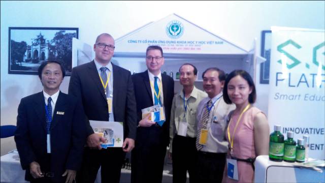 Đại sứ phần Lan tại VN (đứng giữa) tham quan sản phẩm nghiên cứu khoa học khởi nghiệp của Cty VMSA trưng bày tại Hà Nội