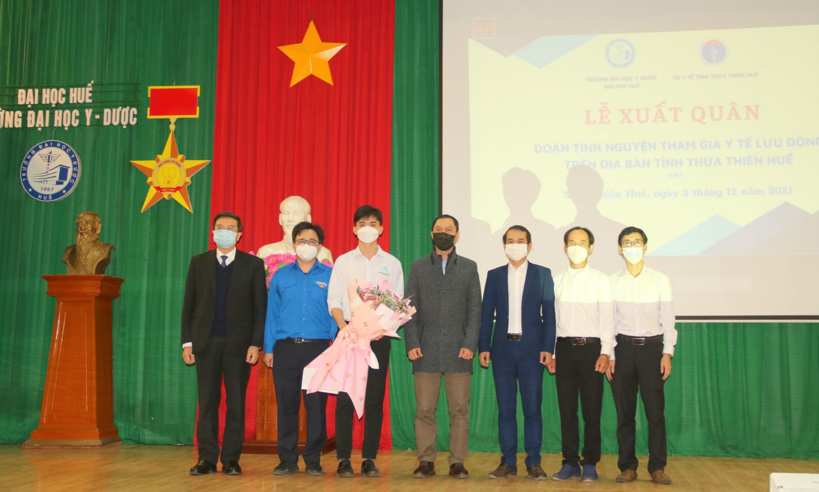 Lãnh đạo Sở Y tế, UBND TP. Huế cùng lãnh đạo nhà trường tặng hoa động viên và chụp ảnh lưu niệm cùng đại diện đoàn tình nguyện