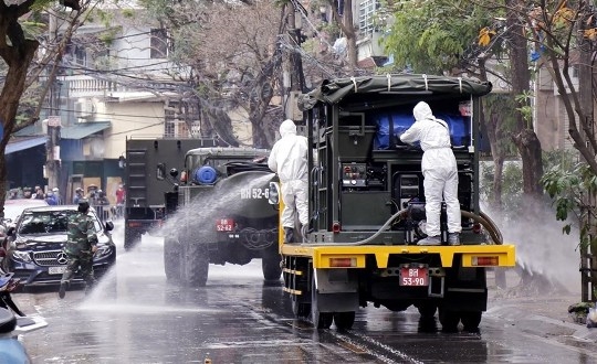 Lực lượng chức năng phun thuốc khử trùng tại phố Trúc Bạch. Ảnh: TTXVN.