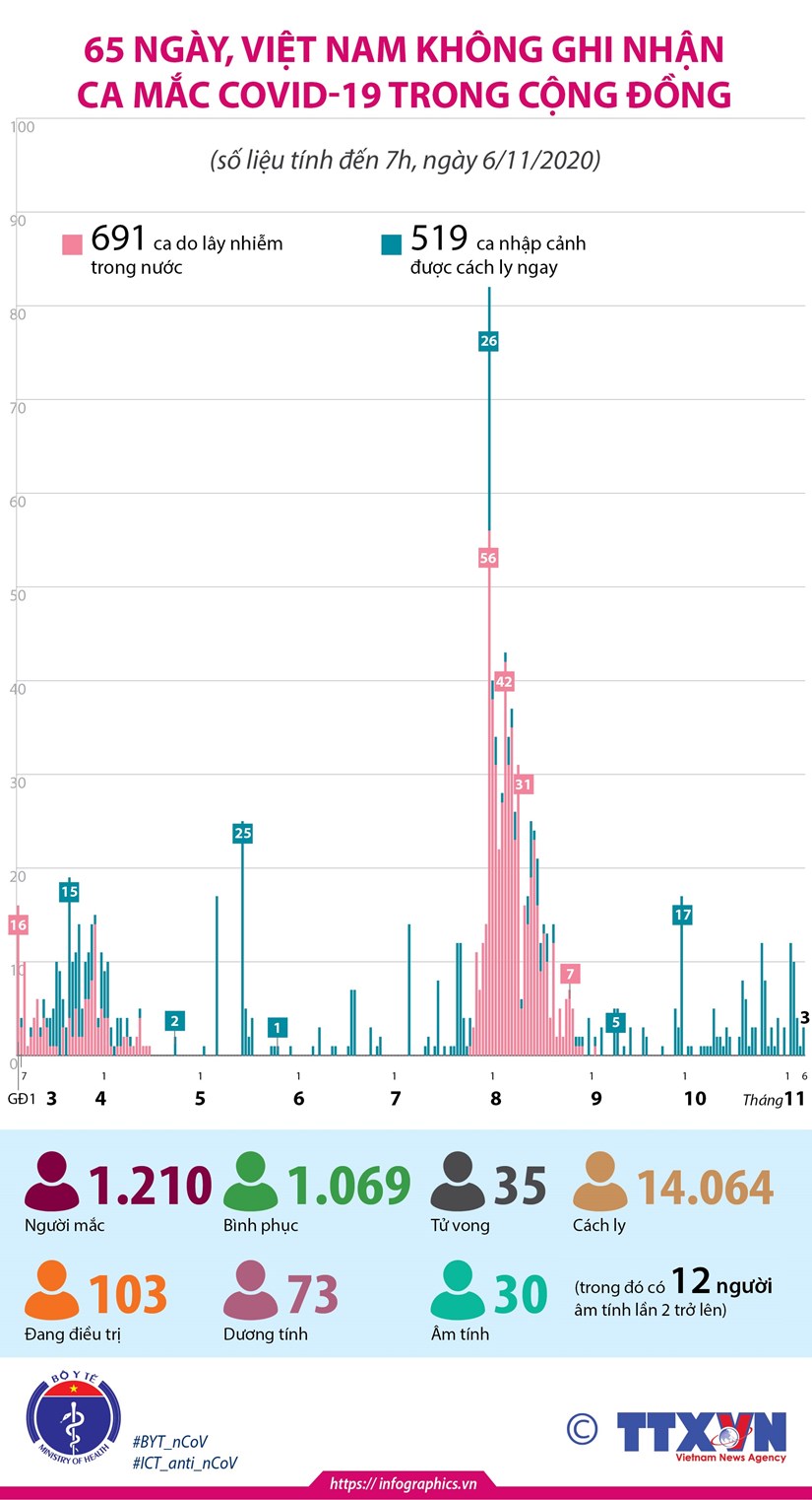 Tính đến sáng 6/11, Việt Nam đã trải qua 65 ngày không ghi nhận ca lây nhiễm COVID-19 ngoài cộng đồng, tuy nhiên nguy cơ dịch quay lại vẫn còn tiềm ẩn.