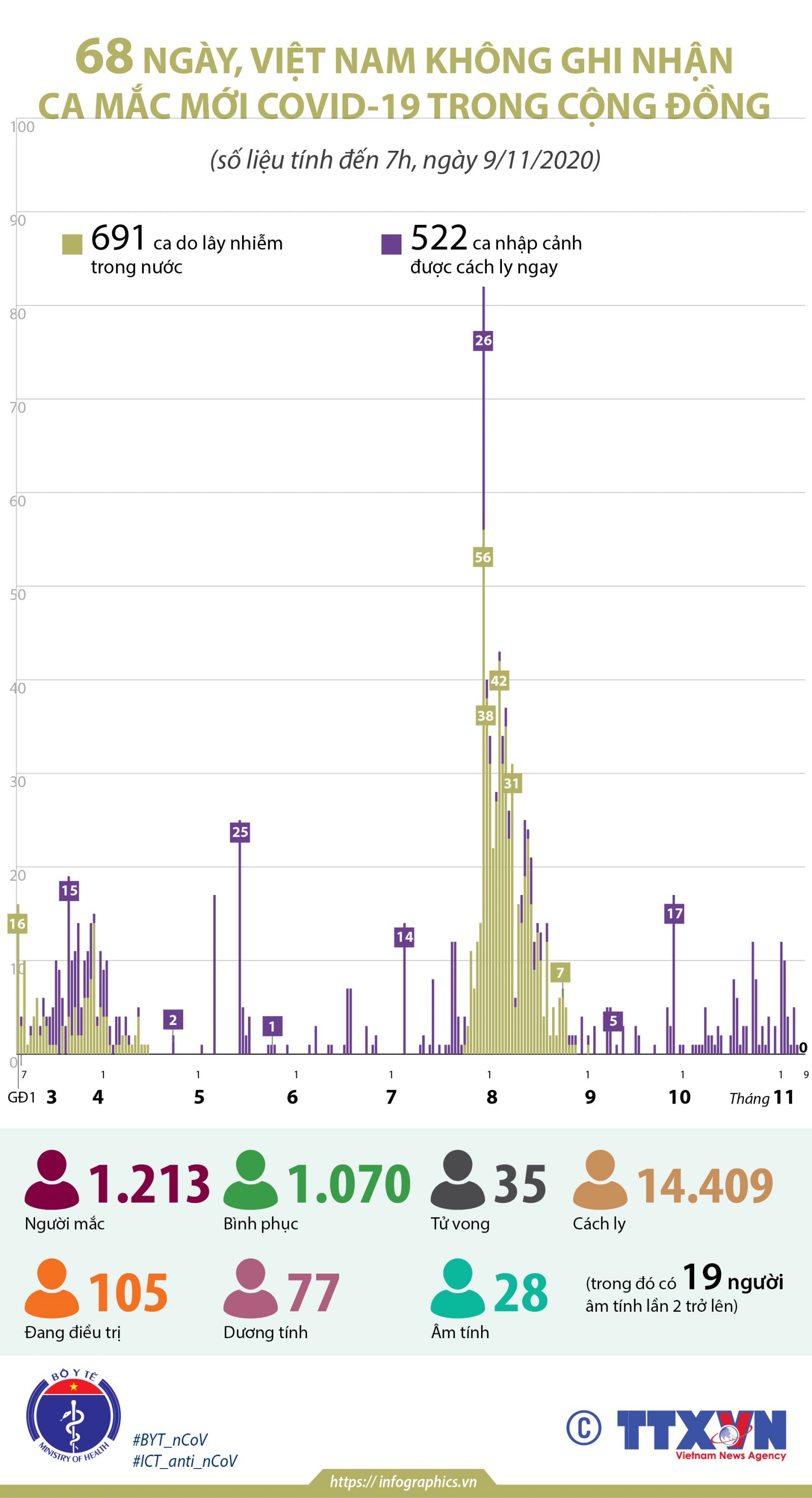 Sáng 9/11, Việt Nam không ghi nhận ca mắc mới COVID-19 trong cộng đồng. Tổng số ca mắc COVID-19 tại Việt Nam hiện là 1.213 ca.