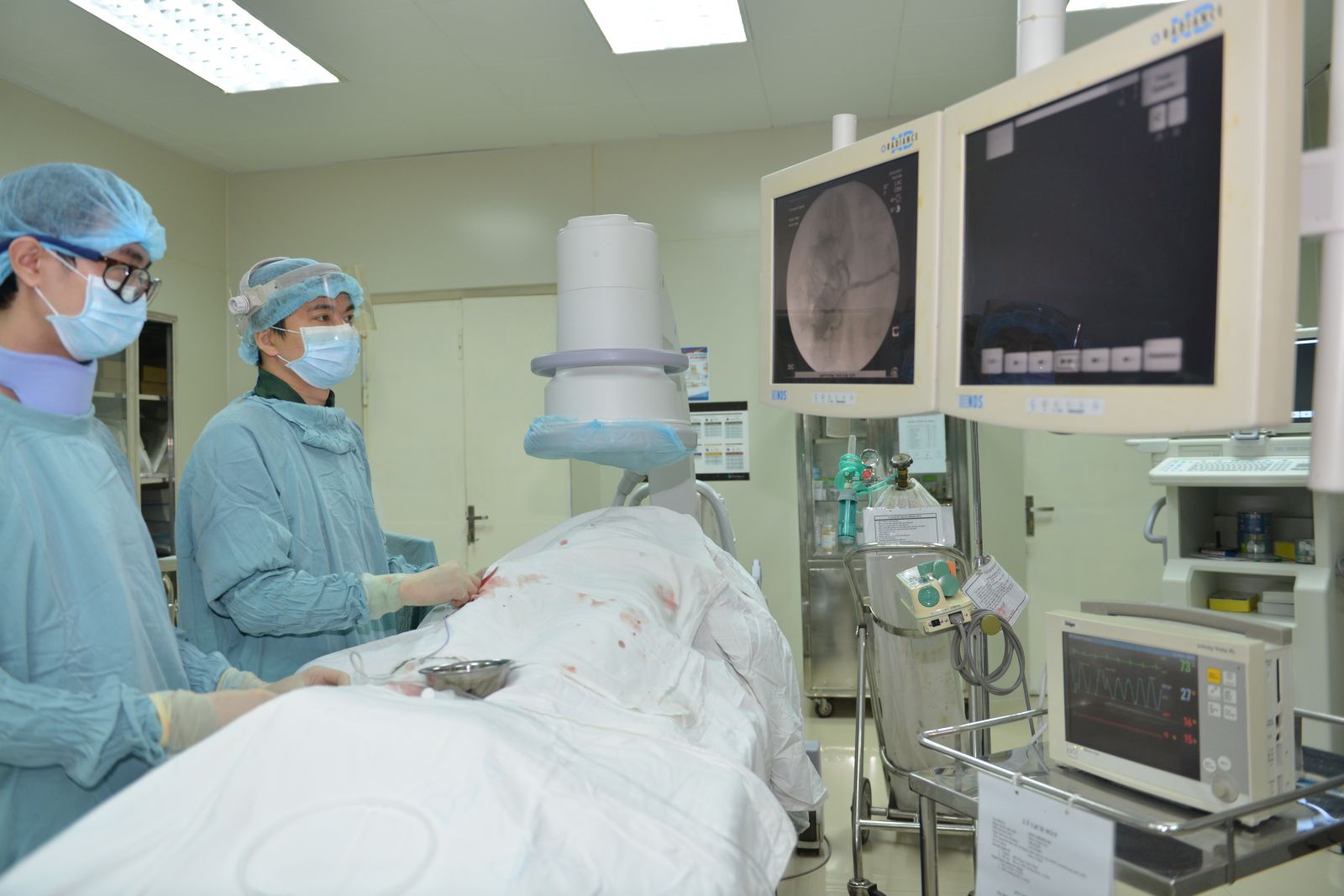 PGS.TS. Hoàng Anh Tiến (thứ hai, từ trái sang) và ekip can thiệp tim mạch cấy thiết bị tái đồng bộ tim điều trị suy tim cho bệnh nhân Ng.