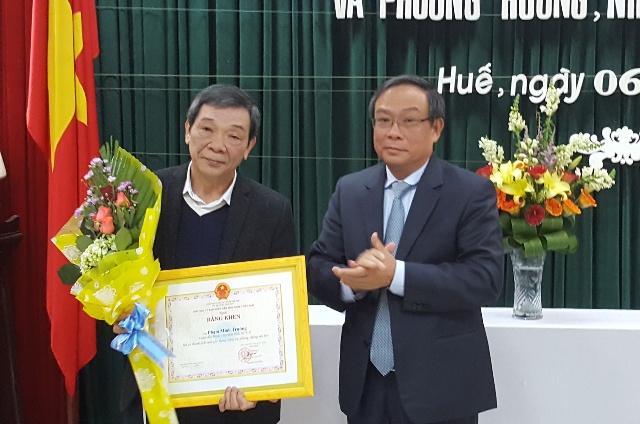 Chủ tịch Nguyễn Văn Cao trao bằng khen của UBND tỉnh cho BS CK II Phạm Minh Trường với danh  hiệu anh hùng chống mù lòa