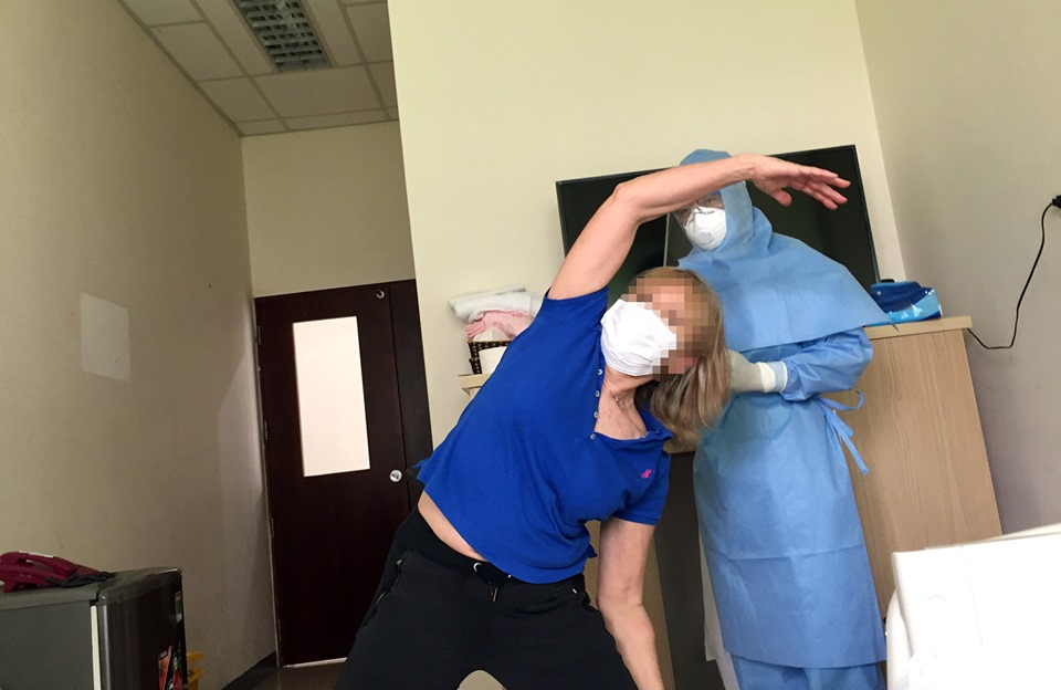 Nữ du khách người Anh và là bệnh nhân thứ 30 đang luyện tập thể dục và sức khỏe đang ổn định tại Cơ sở 2 Bệnh viện Trung ương Huế. Ảnh: NL