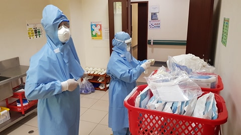 Nhân viên y tế chuẩn bị khám chữa bệnh cho các bệnh nhân nước ngoài trong khu vực cách ly cơ sở 2 Bệnh viện Trung ương Huế. Ảnh: NL