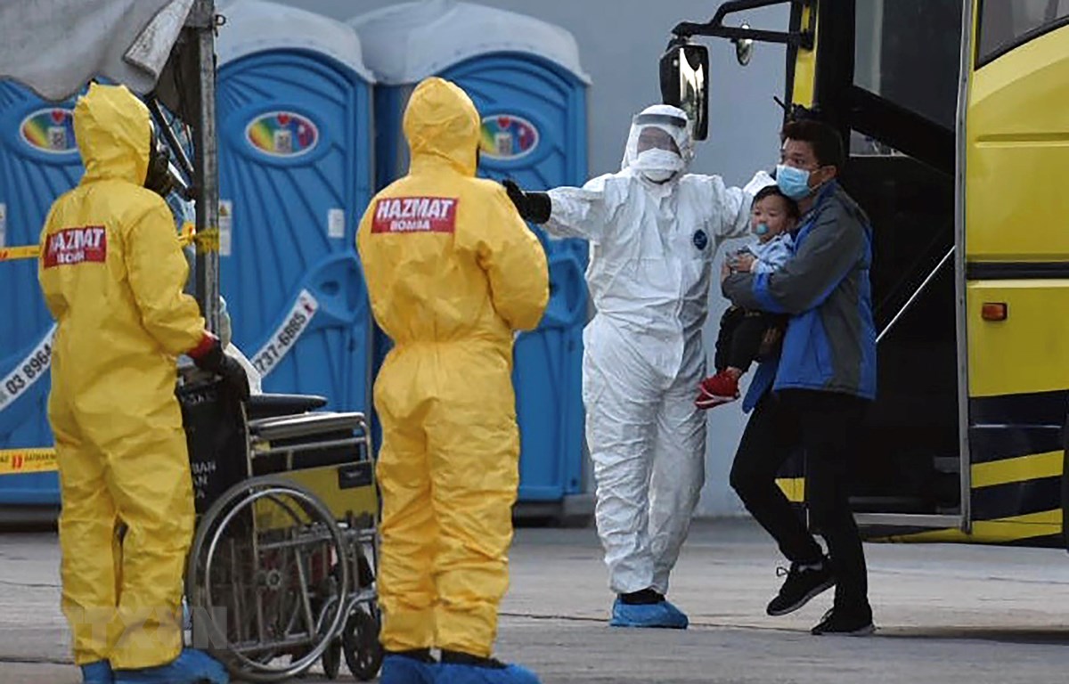 Nhân viên y tế Malaysia đón các công dân nước này được sơ tán từ Vũ Hán, Trung Quốc, tâm điểm của dịch viêm đường hô hấp cấp do virus corona chủng mới, về tới sân bay quốc tế Kuala Lumpur ngày 4/2/2020. (Ảnh: AFP/TTXVN)