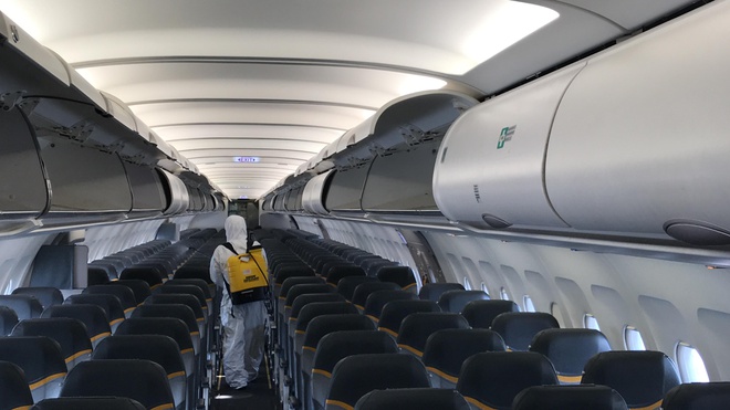 Phun khử khuẩn trên máy bay sau khi hạ cánh. Ảnh: HCDC.