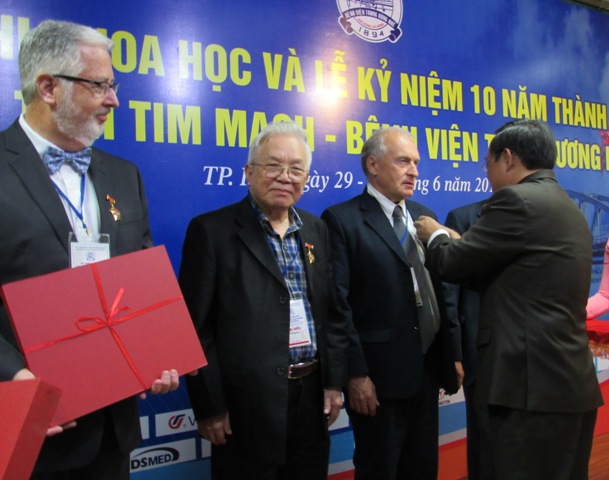 Chủ tịch UBND tỉnh Nguyễn Văn Cao tặng bằng khen và trao huy hiệu của UBND tỉnh cho các nhà khoa học, chuyên gia lĩnh vực tim mạch trong nước và quốc tế