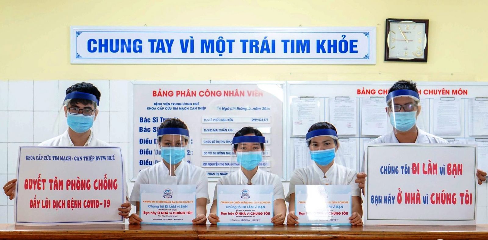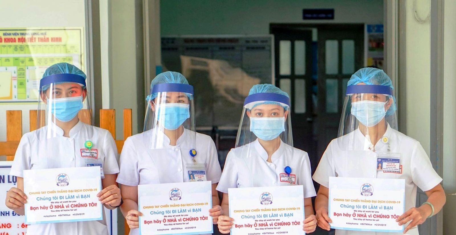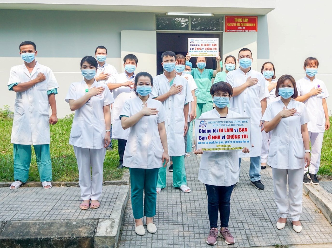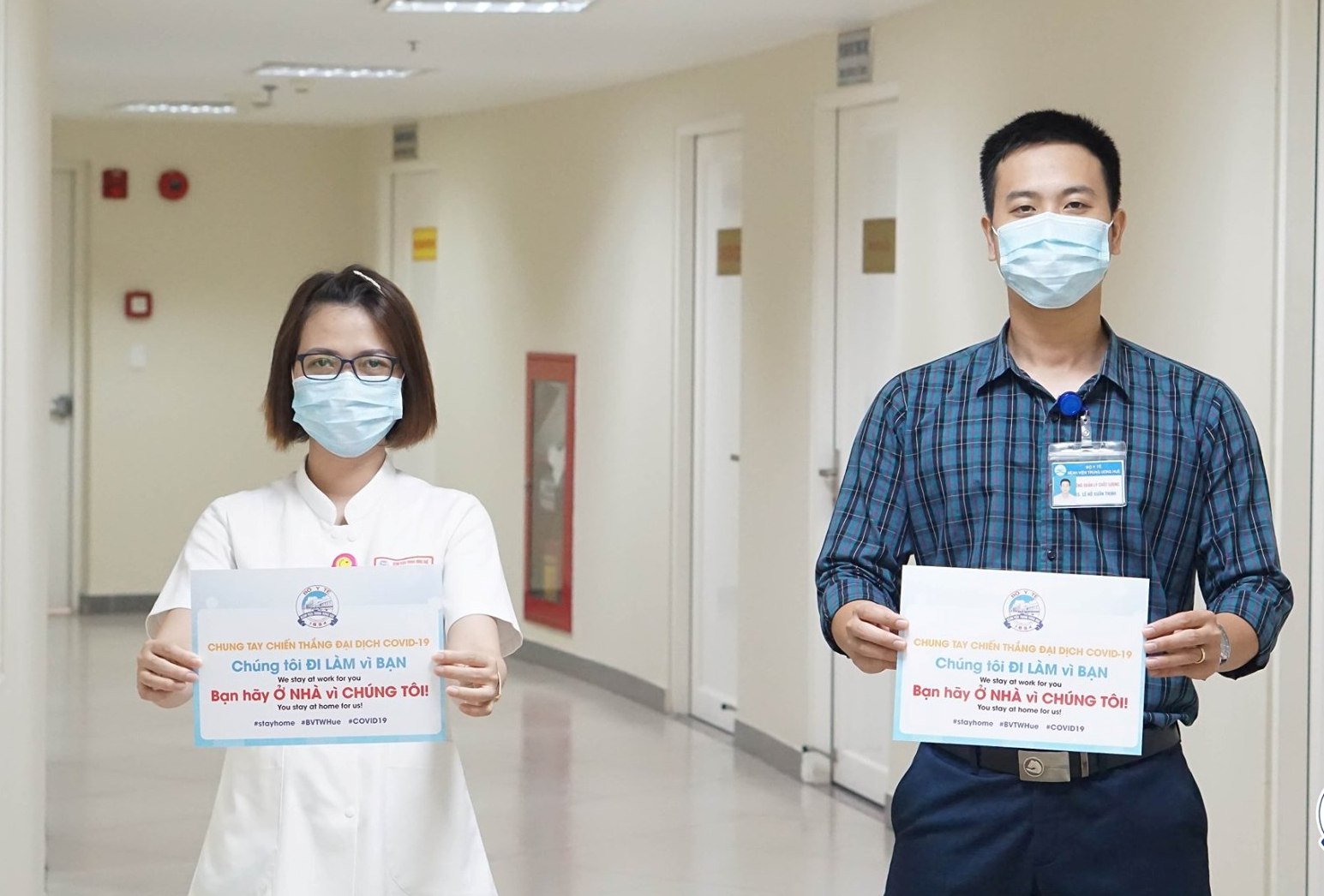 "Chúng tôi đi làm vì bạn, bạn hãy ở nhà vì chúng tôi", cùng sát cánh với những đồng nghiệp ngành y trong cả nước, đội ngũ nhân viên y tế Bệnh viện Trung ương Huế cũng đã nhanh chóng hưởng ứng thông điệp trên nhằm lan tỏa tinh thần đoàn kết, quyết tâm chiến thắng đại dịch COVID-19, đặc biệt là trong 15 ngày thực hiện cách ly toàn xã hội.