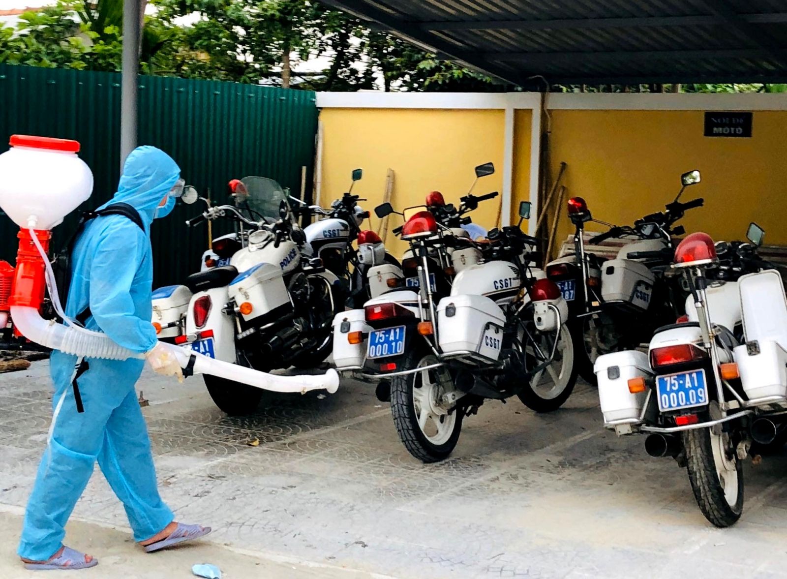 Phun thuốc diệt khuẩn tại trụ sở Phòng CSGT Công an tỉnh