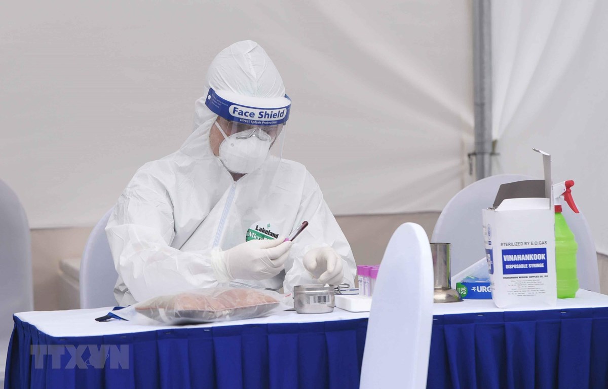 Xét nghiệm nhanh COVID-19 tại Trạm Nhà văn hóa phường Yên Hòa, quận Cầu Giấy, ngày 3/4