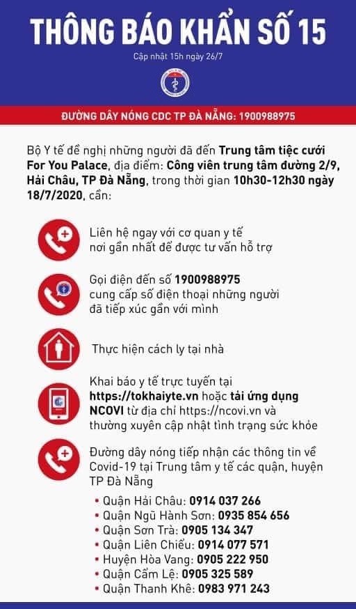 Lúc 15h chiều nay (26/7), Bộ Y tế đã phát đi thông báo khẩn số 15 và đề nghị những ai đã đến Trung tâm tiệc cưới For You Palace, địa điểm tại Công viên Trung tâm đường 2/9, Hải Châu, TP Đà Nẵng, trong thời gian từ 10h30-12h30 ngày 18/7/2020 cần liên hệ ngay với cơ quan y tế nơi gần nhất để được tư vấn hỗ trợ.