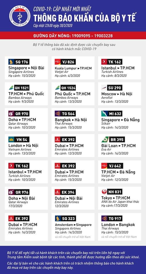 Đến ngày 21/3, Bộ Y tế thông báo đã xác định được 21 chuyến bay có hành khách mắc COVID-19.