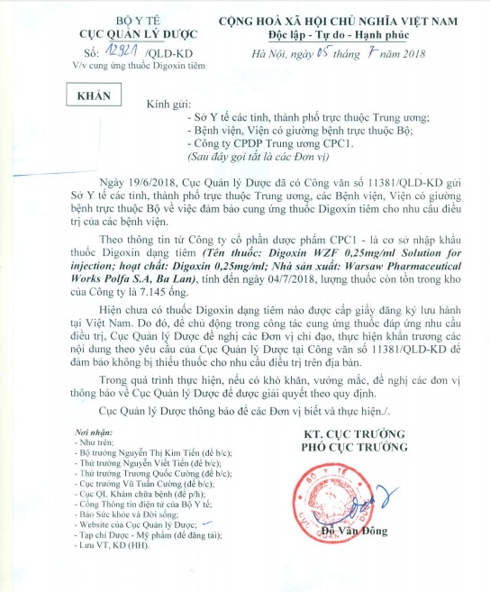 Trước đó ngày 19/6/2018, Cục Quản lý Dược đã có công văn yêu cầu các đơn vị về việc đảm bảo cung ứng thuốc Digoxin tiêm cho nhu cầu điều trị của các BV. Cục Quản lý dược đề nghị Công ty CP Dược phẩm trung ương CPC 1 trước mắt ưu tiên cung ứng thuốc cho các đơn vị đã có công văn đề nghị cung ứng Digoxin; lập hồ sơ đề nghị nhập khẩu thuốc theo quy định để cung ứng kịp thời cho các cơ sở.