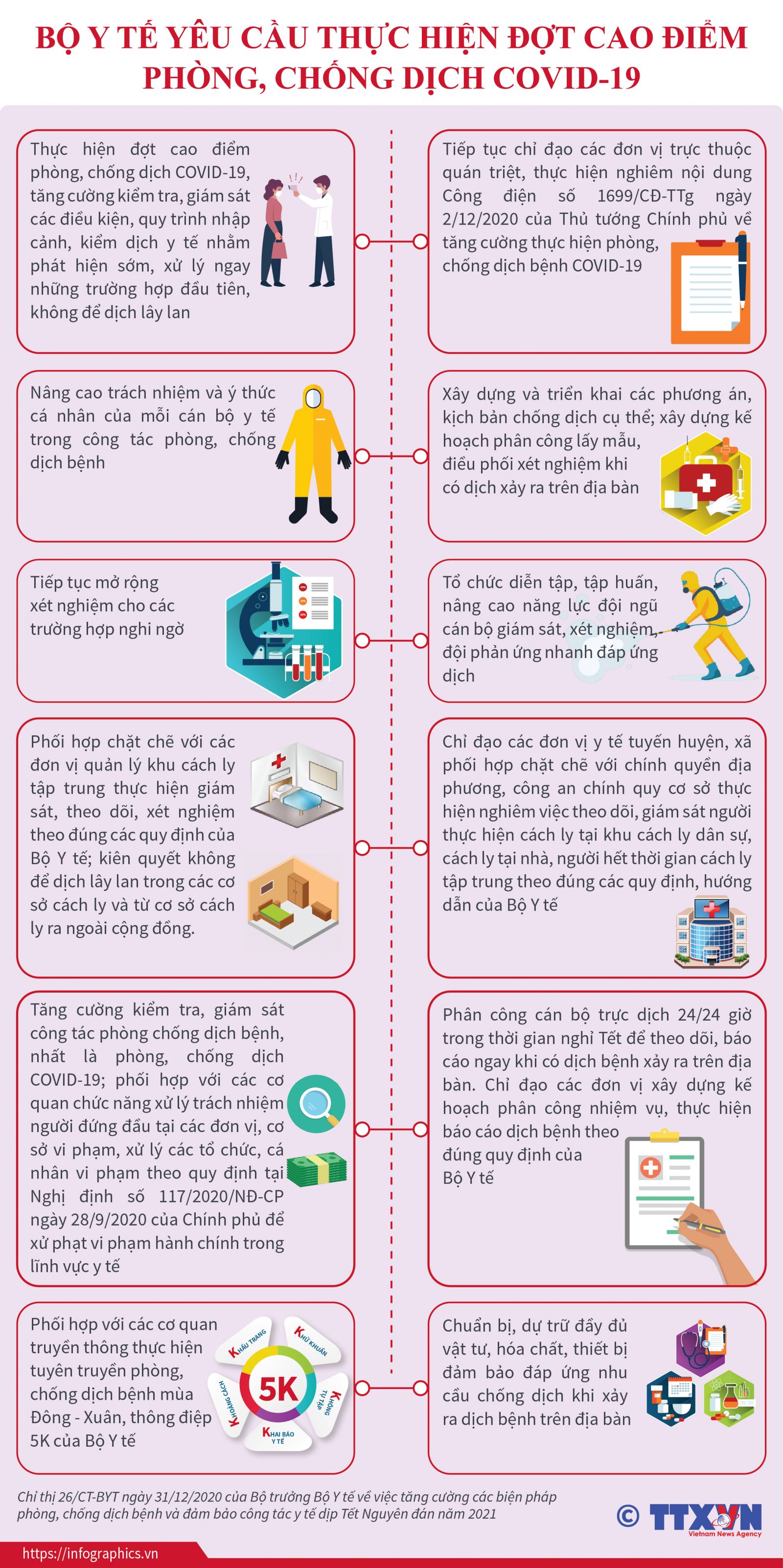 Ngày 31/12/2020, Bộ Y tế đã ban hành chỉ thị 26/CT-BYT về việc tăng cường các biện pháp phòng, chống dịch và đảm bảo công tác y tế dịp Tết Nguyên đán năm 2021. Theo đó, Bộ Y tế yêu cầu Sở Y tế các tỉnh, thành phố trực thuộc Trung ương thực hiện nghiêm các nhiệm vụ sau: