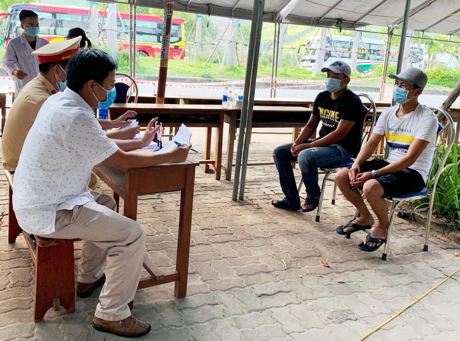 Hai tài xế: Hoàng Trọng Quý và Nguyễn Quang Duy (phải) tại buổi làm việc với Tổ liên ngành tại chốt kiểm soát số 4
