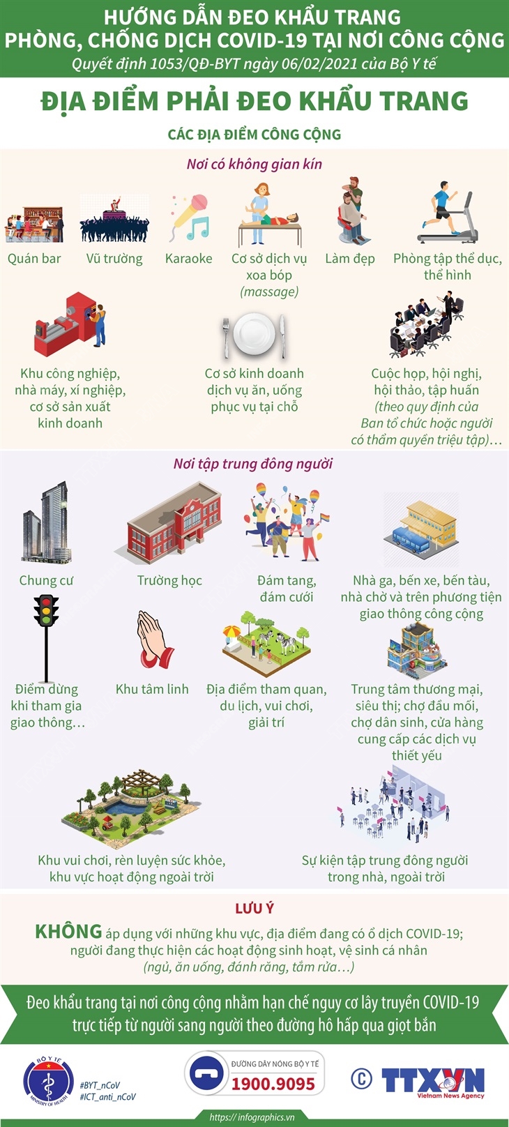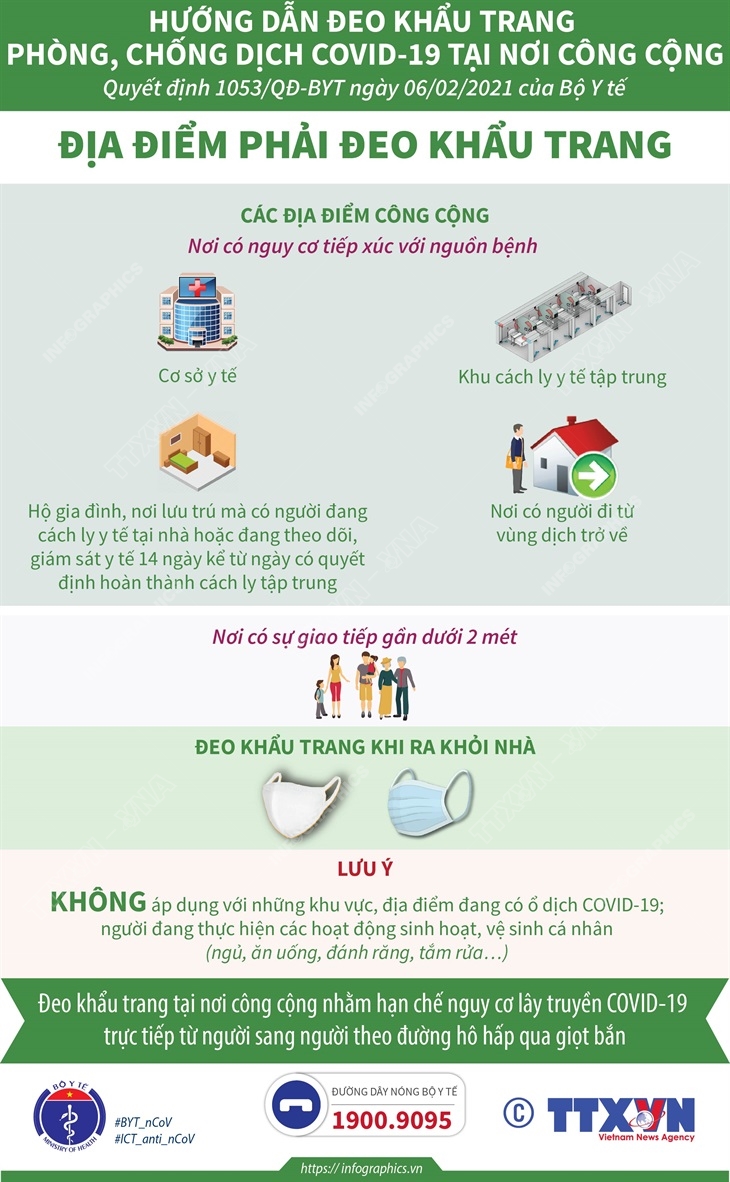 Để phòng, chống dịch COVID-19, mọi người cần nghiêm túc thực hiện đeo khẩu trang tại nơi công cộng, đặc biệt tại những nơi có nguy cơ tiếp xúc với nguồn bệnh, nơi có tiếp xúc gần dưới 2 mét. Mục đích là nhằm hạn chế nguy cơ lây truyền COVID-19 trực tiếp từ người sang người theo đường hô hấp qua giọt bắn.