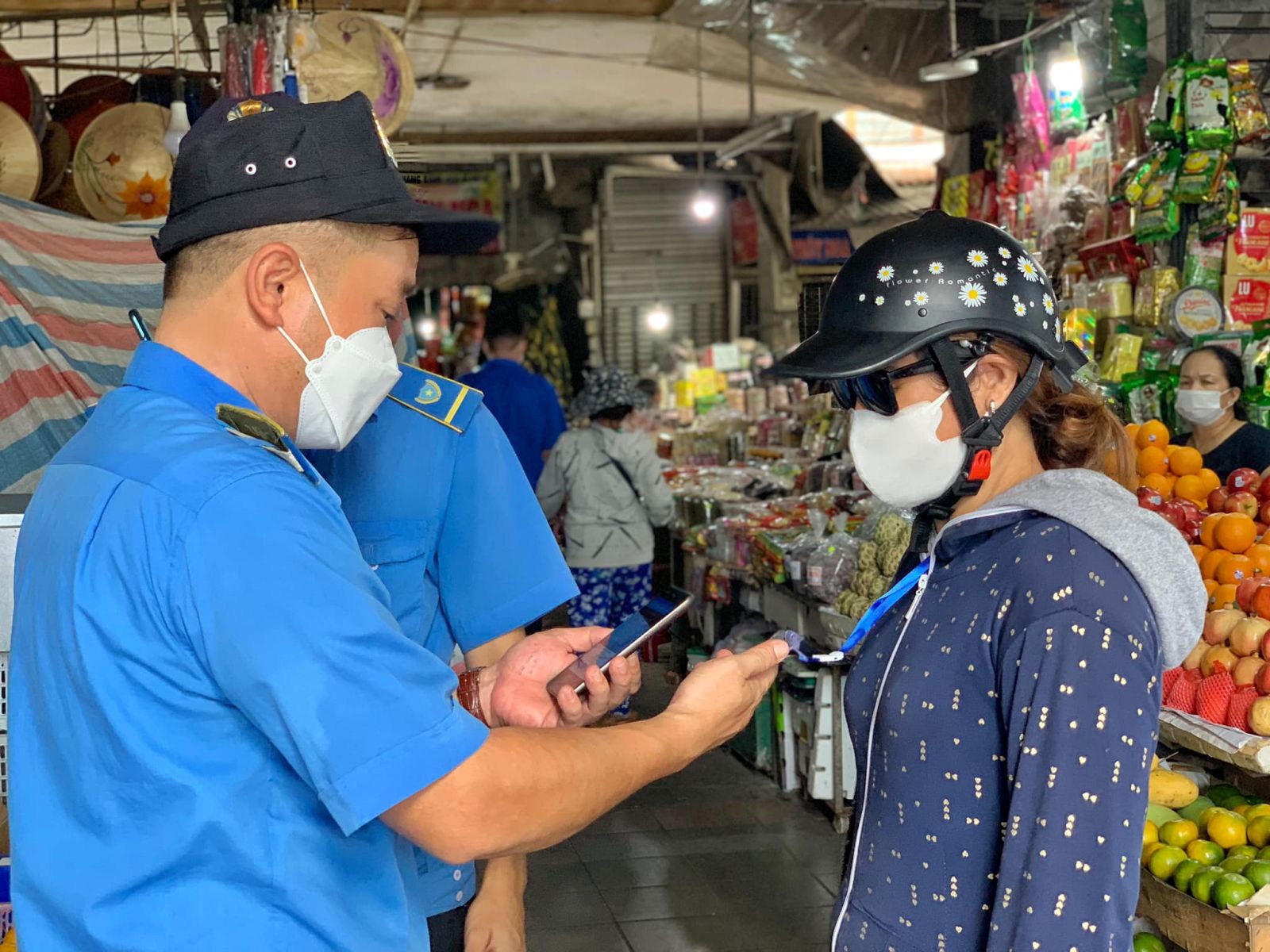 Nhân viên Ban quản lý chợ Đông Ba quét thẻ cho khách hàng trước khi vào chợ mua sắm