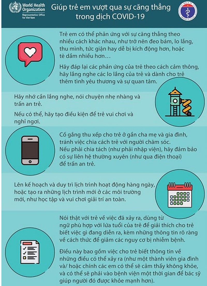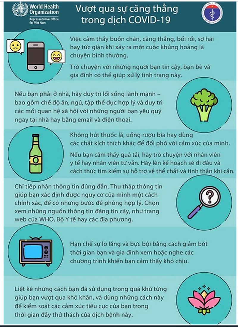 Bộ Y tế và Tổ chức Y tế Thế giới tại Việt Nam xây dựng infographics khuyến cáo những phương pháp đơn giản giúp người lớn và trẻ em vượt qua căng thẳng trong dịch bệnh COVID-19.