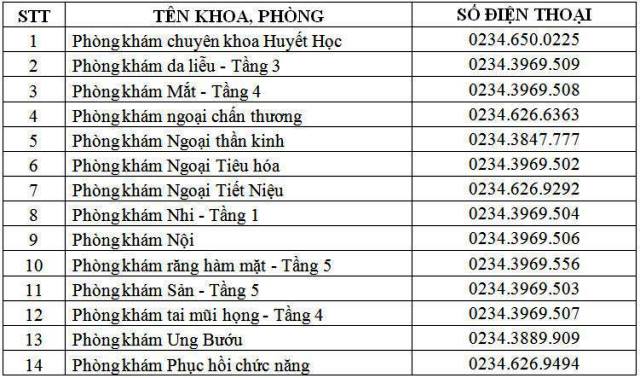 Ngoài số tổng đài, Bệnh viện Trường Đại học Y dược Huế cung cấp số điện thoại của các phòng khám chuyên khoa thuộc bệnh viện để người có nhu cầu liên hệ