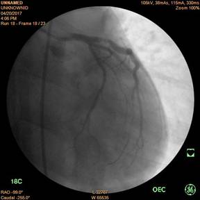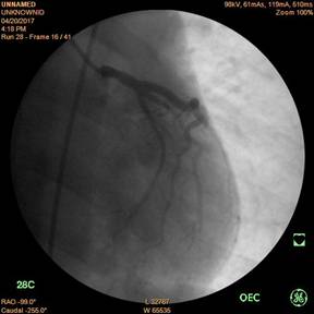 Bệnh nhân tên là Võ Hữu T., 30 tuổi, ở Phú Lộc, tiền sử hút thuốc lá và uống rượu nhiều. Bệnh khởi phát cách nhập viện 10 ngày với biểu hiện sốt, đau họng, ho, đau ngực sau xương ức tăng lên khi ho, đau ngực khi gắng sức. Các xét nghiệm cho thấy có hội chứng nhiễm trùng và tăng men tim, có dấu chứng tổn thương tim trên điện tâm đồ, làm siêu âm tim cấp cứu với kết quả giảm vận động buồng tim, chức năng tim giảm, được hội chẩn khẩn. Với quyết định chụp và can thiệp khẩn trương, bệnh nhân đã được nong và đặt stent động mạch vành trái.