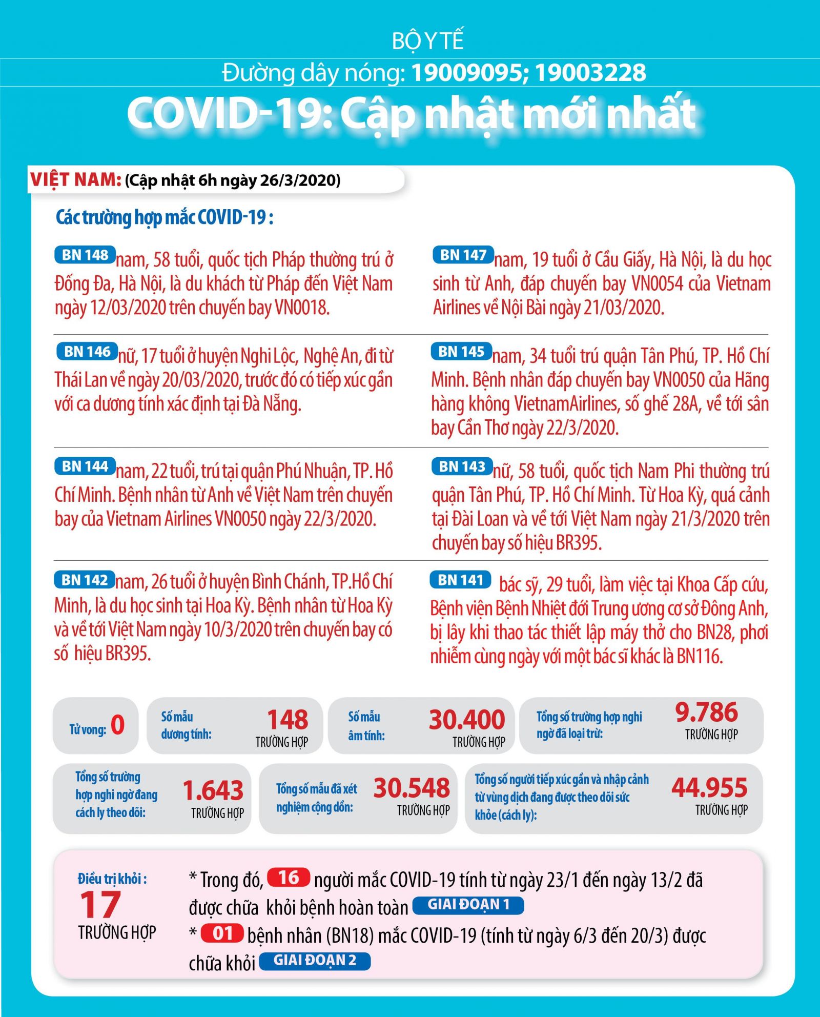 1. Tổng số ca mắc mới tính từ 9h ngày 25/3 đến 9h ngày 26/3 trên tổng số ca tích luỹ: 14/148.