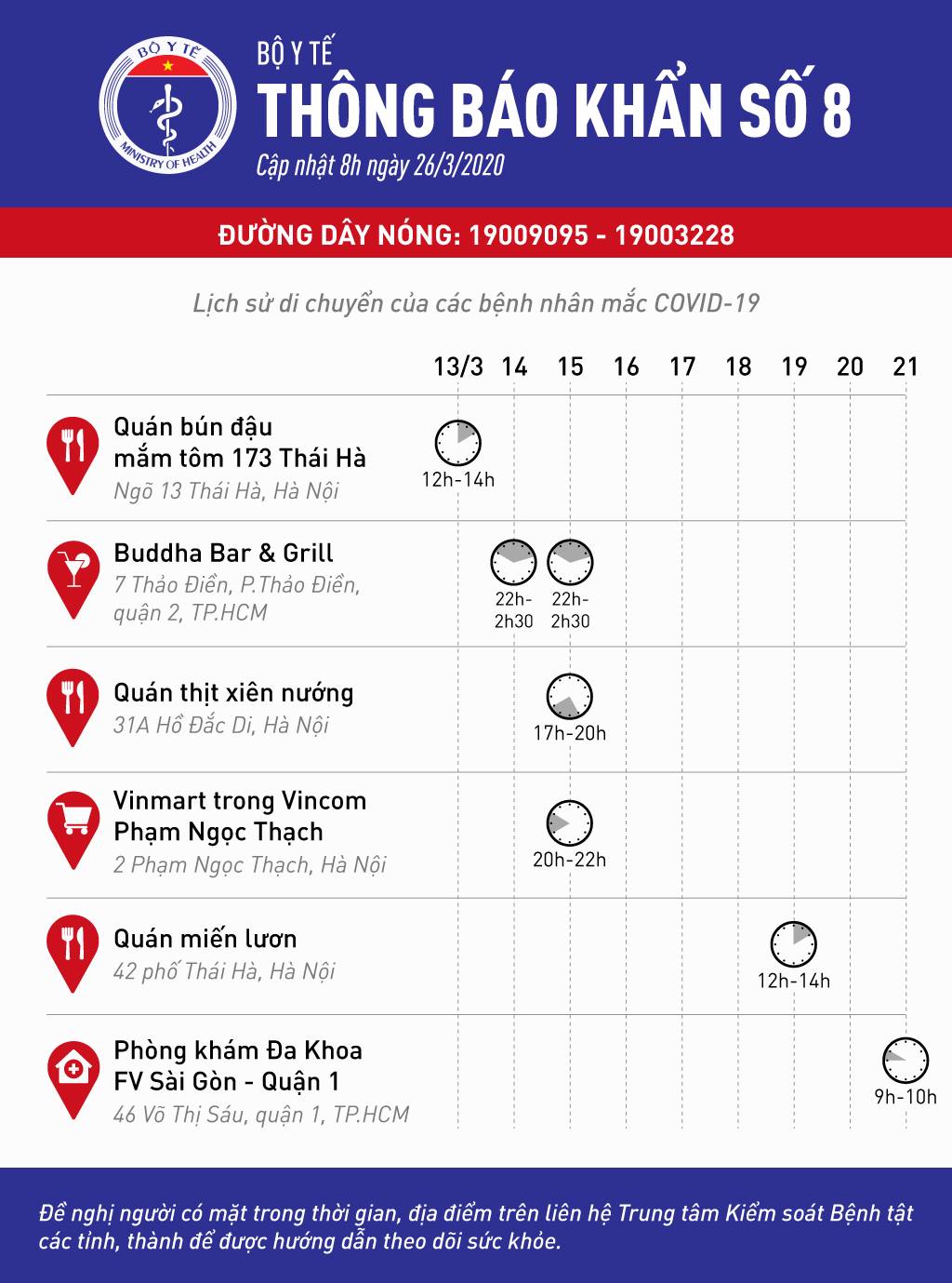 8h20' ngày 2/3, Bộ Y tế đã phát đi thông báo khẩn số 8 cho biết, đã xác định được lịch sử di chuyển của các bệnh nhân mắc COVID-19.