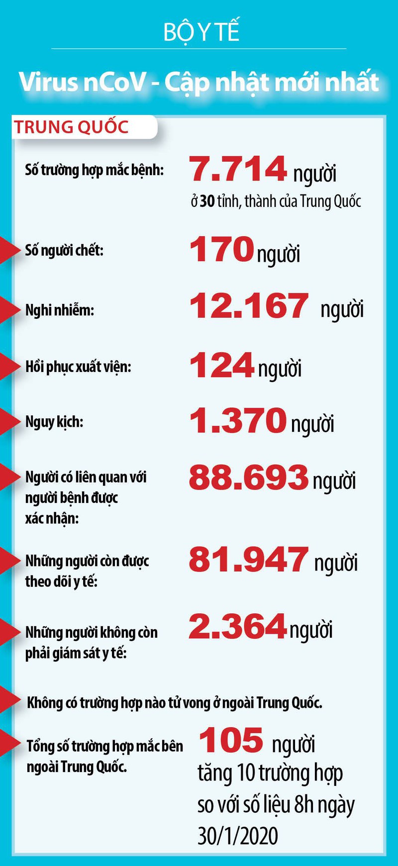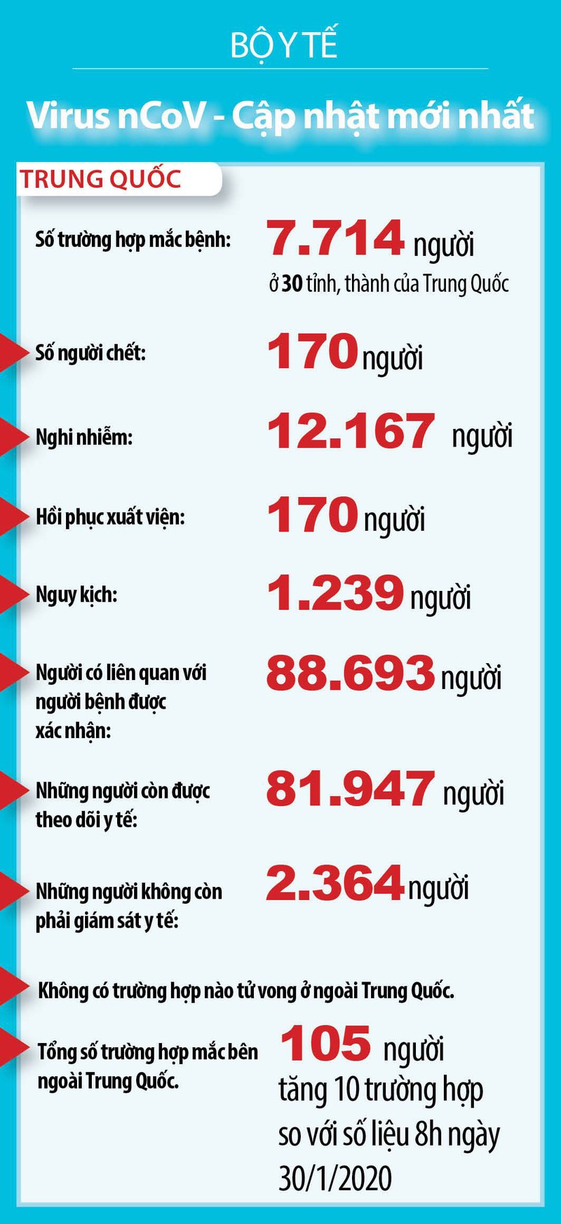 Theo số liệu cập nhật của Bộ Y tế về tình hình bệnh viêm đường hô hấp cấp do virus nCoV đến 10h00 ngày 30/1/2020, số người mắc bệnh trên thế giới là 7.819 trường hợp, 170 tử vong; Tổng số trường hợp mắc bên ngoài Trung Quốc: 105, tăng 10 trường hợp so với lúc 8h00 ngày 30/1/2020.