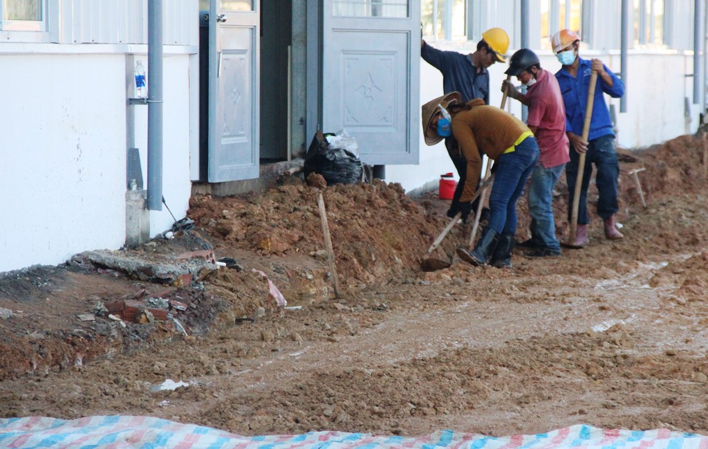 Bên ngoài khu thu dung và điều trị F0 không triệu chứng hoặc triệu chứng nhẹ tại cơ sở Công ty cổ phần Hello Quốc tế Việt Nam, các công nhân tranh thủ thời tiết nắng ráo để làm đường dẫn vào