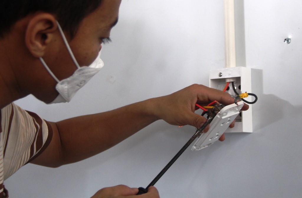 Một công nhân đang lắp đặt, đấu nối hệ thống điện đến các phòng, giường bệnh
