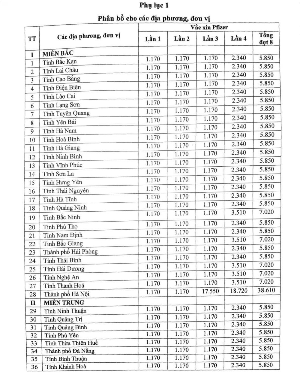 Số vắc xin này được chi làm 4 đợt, phân bổ cho 63 tỉnh, thành phố trên toàn quốc và lực lượng quân đội, công an với 576.810 liều. Ngoài ra còn phân bổ cho 21 bệnh viện và viện với 169.650 liều.