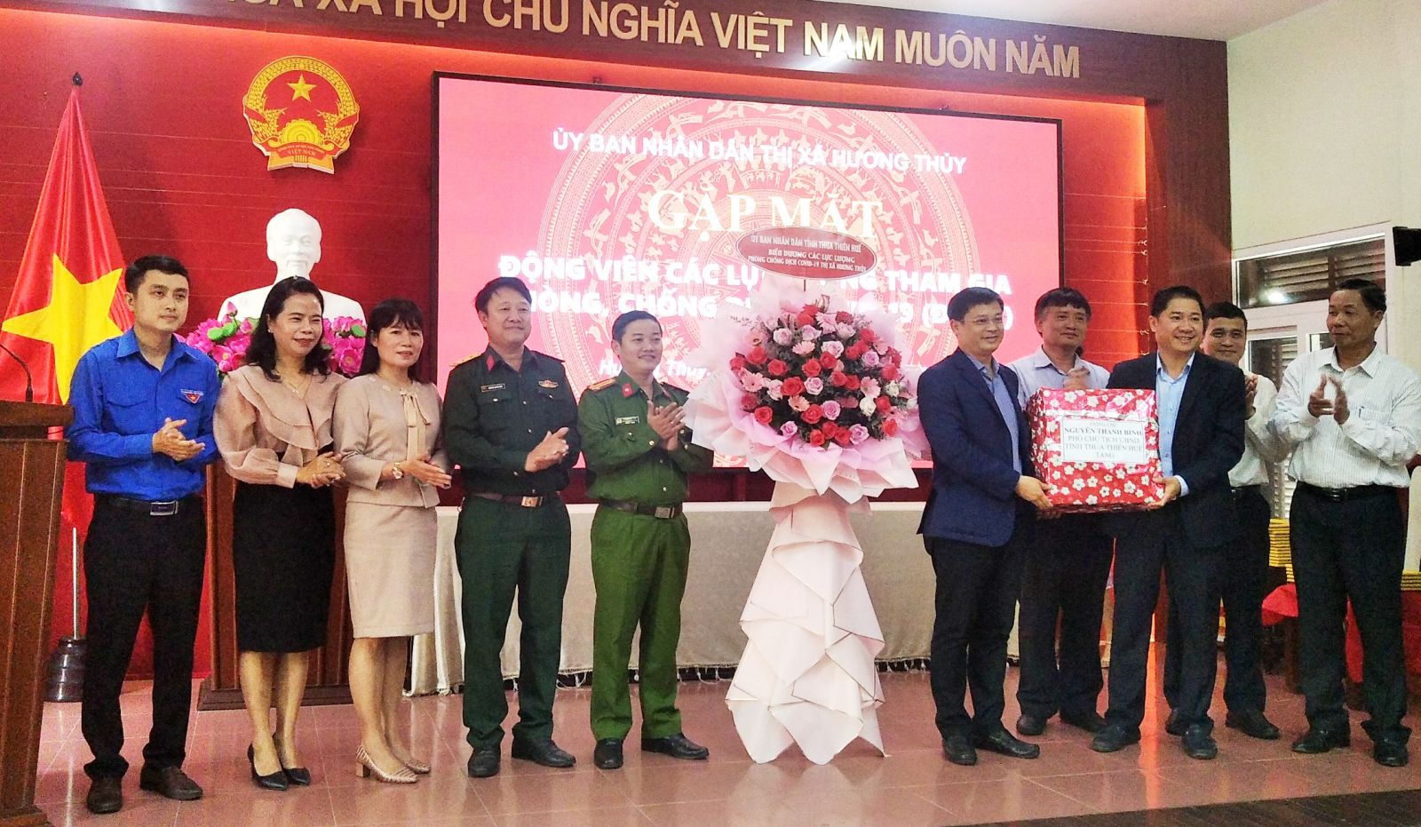 Dịp này, Phó Chủ tịch UBND tỉnh - Nguyễn Thanh Bình đã tặng hoa và quà cho các lực lượng trực chiến tại chốt kiểm soát y tế Cảng HKQT Phú Bài; UBN TX. Hương Thủy khen thưởng 5 tập thể, 18 cá nhân có thành tích tiêu biểu trong công tác phòng, chống COVID – 19.