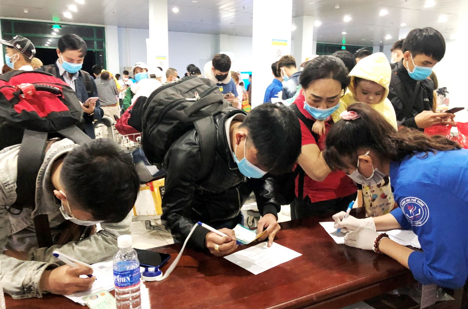 Các lực lượng tích cực hỗ trợ hành khách khai báo liên quan đến phòng, chống COVID - 19 tại Cảng HKQT Phú Bài